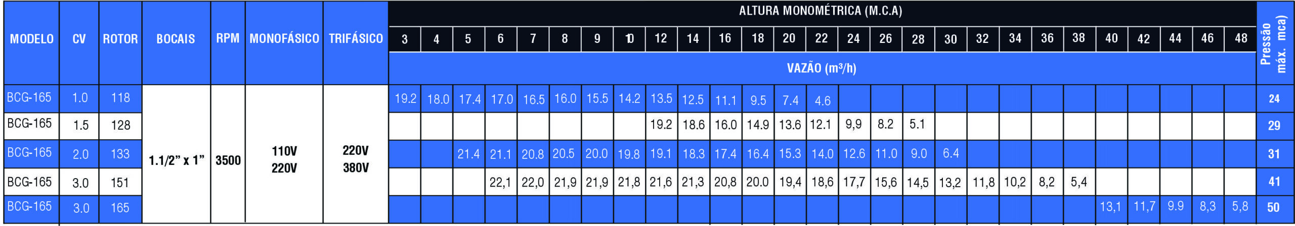 • Pressão máxima: 52 mca