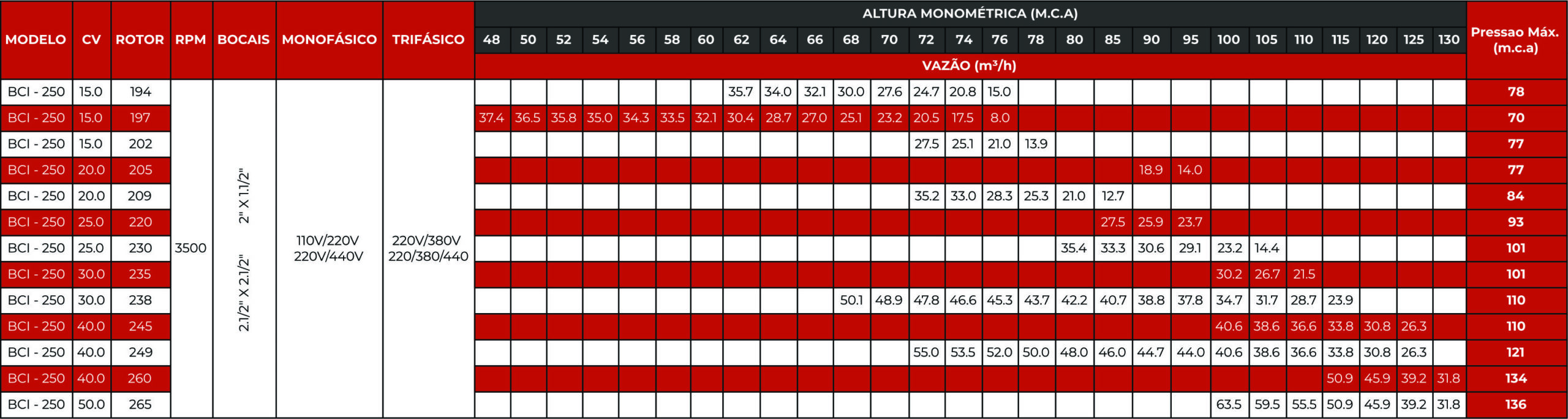 A Motobomba Centrífuga Monoestágio Monobloco da marca BOMBASA  é uma solução potente e confiável, equipada com motor monofásico ou trifásico em II polos, operando a 60Hz e 3500rpm. Projetada para bombear água limpa até 70ºC (opções para temperaturas superiores disponíveis sob consulta), ela conta com bocais com rosca BSP, sucção de 2.1/2″ e recalque de 2.1/2″, oferecendo vazão máxima de 63,5 m³/h (mínima de 11,4 m³/h) e pressão máxima de 134,2 mca (mínima de 48,0 mca). Ideal para aplicações que demandam alta performance e durabilidade, com fornecimento padrão na cor vermelho Munsell para usos em combate a incêndio.
